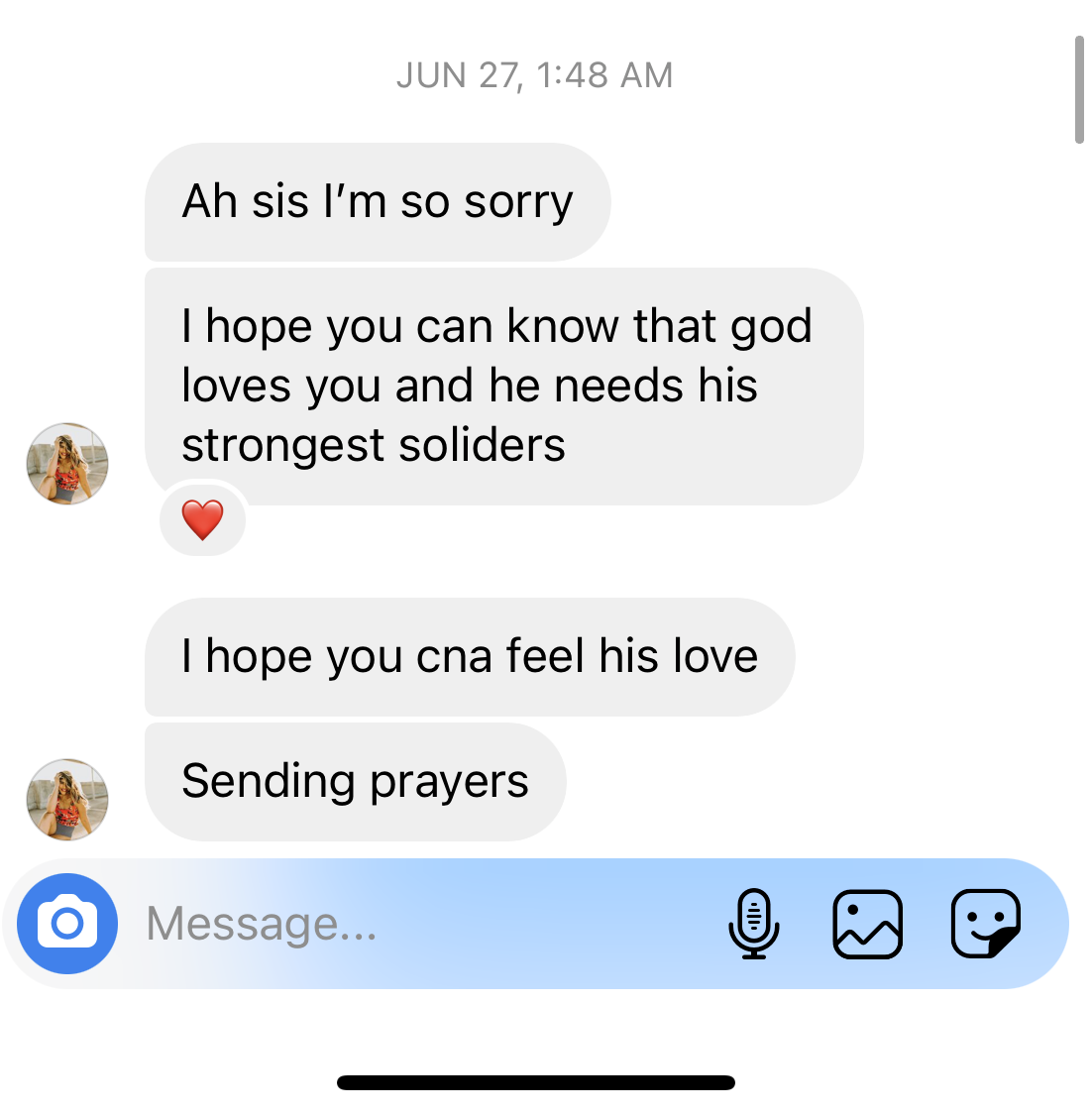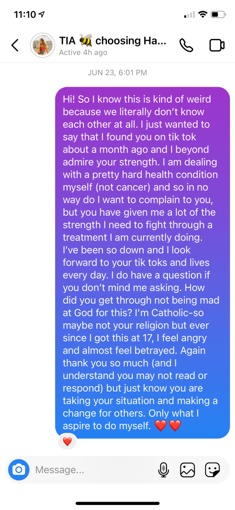 One night, I was sitting on TikTok and just scrolling on my fyp. I stopped at this women I found who was just diagnosed with cancer. Her name was Tia Stokes. Now I was just shocked that she was diagnosed with cancer and didn’t seem to be angry or negative about it. This of course sparked my interest. How in the world could someone be given this horrible diagnosis and still be happy???? I scrolled to before she was diagnosed just so I could see what she was like “before”. I was looking for that change in personality that I could completely see in myself. The thing was-I couldn’t find it. There was this catch about Tia. She is Mormon. So-here and there she said some things about Jesus on her TikToks. Of course I rolled my eyes and chalked it up to “that’s what everyone says”. Luckily for me, Tia also went live on Youtube every night. So, one night I clicked on just to see her. I was planning on seeing sadness and negativity. But all I saw was faith and gratefulness. Gratefulness. Let that sink in. How could someone be grateful when they have cancer (or any illness)? Now I continued watching Tia and as the days kept going, I started to realize that this was no act. This wasn’t something that would get old. Tia truly was (and is) grateful for everything. On her lives, she talked a lot about God. The way she would explain it would leave me in tears every night. Someone who got why I feel like I was abandoned. And someone who explained to me that He has been there all along. This is personal, but I’d like to share my first ever dm with Tia: