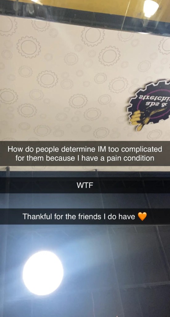 This was a snapchat story I posted on a private story. If you don’t know about my private story- my bad. Anyways, I posted this as I was working out at the gym. No, nothing specific happened that caused this reaction. But when I am at the gym, I typically have time to just be in my own thoughts. I reflect on how I’m doing and think about how I should handle things. This is something that constantly came to my mind: people (girls and guys) running the minute they find out I have a pain condition. I’ve heard things like “I’m too complicated” or that no one wants to bring someone in their life who is “problematic”. Would you want to know that people will run from you like the plague?